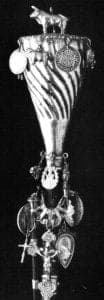 Ecclesiastical silver of the colonial period was both decorative and functional, and in the case of altars, pulpits, baptismal fonts, baldachins, and processional pallets, sometimes architectural as well. Many objects were typical of items found in any European church: missal stands, candelabras, holy water fonts, pyxis, crucifixes, censers, ciboria, sanctuary lamps, sconces, reliquaries and monstrances (sometimes encrusted with huge jewels), cruets, and chalices.