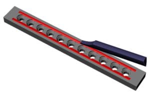 - Next, make the center line relief cut that will make the stones appear to float in the prongs. Use an onglette or round bottom graver and cut a centerline from hole to hole along the entire length of the pavé run. The depth should be just below where the girdles of the stones will be.