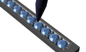 - With a graver, nudge the prongs tight on the stones. You want to move the prongs toward the center space between the stones. All but the final set of prongs on either end should be contacting and holding two stones. Round off the top of each prong with the proper size beading tool. Ideally, the tool should just cover the entire prong. Once complete, your single-row pavé piece will be ready to go.