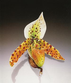 | Tropical Orchid (brooch), 2003 Fine silver, 24K, 18K, 14K yellow gold, enamel, pearl 3 1/4 x 2 1/2 x 1 1/2 " Photo: Ralph Gabriner |