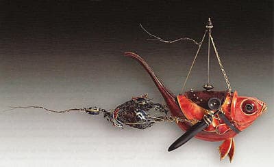 Where will Freda's work go next? It is becoming more abstract, combining a favorite example of wild life with geometric shapes and occasional jewels such as pearls. It is also becoming more surreal. When Mobilia Gallery invited artists in 2002 to submit work based on a favorite painting, he created a "fish hunter" brooch in the style of Hieronymus Bosch an amazingly whimsical piece portraying a brilliantly colored fish, arrayed with sword and saddle, boating home with a net full of tiny blue fiddlers each no more than one quarter inch long. The effect is simultaneously powerful, funny, and creepy.