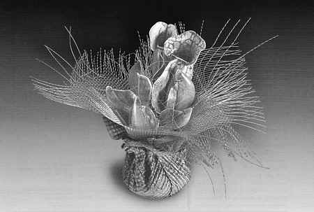 At the back of his mind there is still the L-word: Lalique. One way he may succeed the master is with flowers. Freda's current passion is orchids. After careful observation, each flower is mentally deconstructed into 10 or more components. The petals arc cast separately, the "whiskers" fabricated, then run through a rolling mill. Each piece is enameled with 200 grit Ninomiya (or old Thompson) leaded colors, in a very small kiln with carefully controlled heat. Not surprisingly, Freda breaks some of the purist rules of application. He does not wash the enamels-this does not appear to hurt their clarity-and often uses them without flux. Instead of making them adhere with Klyr-Fyr or gum tragacanth, he makes his own sticky compound with Klyr-Fyr, lilyroot powder, and spit. Holding each tiny piece with a wire suspender, he sifts on a coat of enamel, propping the wire and piece into a wire trivet, and firing it for about one minute at 1400-1450 degrees F. Each coat is carefully checked for color against the living flower. After the third coat he usually sands the piece and corrects the fit, repeating up to nine to ten firings to get the precise color.