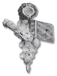 A classic example of his work is his "signature neckpiece" of hatching Northern black rat snakes, a piece that is so popular it is his only limited production item. He got the idea when he found black rat snake egg cases on an outdoor trip, and made the prototype with actual specimens. They did not hold up well, so his next version was cast in sterling, depleted, and enameled a luminescent white The third time, he cast the whole thing in fine Biker, the snackelets in authentic wiggles, enameled each component, and ingeniously cold connected everything. The "yeech" factor did not hurt sales. A current client of Freda's who bought the necklace admitted to being afraid of snakes.