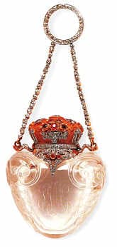 ![]() | Tiffany & Co. Heart- shaped Vinaigrette with Finger Chain Late 19th century Rock crystal, platinum, yellow gold, rubies, diamonds Height 11/2″ |