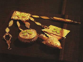 ![]() | Mikala Naur Aromatic Tea Egg Necklace, 1995 Metal tea eggs, gold leaf, gold chain, plastic filament Length 181/2″ A small piece of scented cloth is inserted into each egg. |