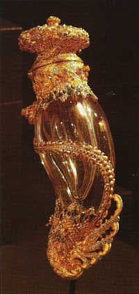 First winning favor in the fourteenth century, liquid perfumes, such as floral bouquets, had another purpose. They were used not so much to scent the air as to scent the self: both the skin and the clothing (especially the handkerchief) that surrounded it. Hungary Water, the first alcohol-based perfume, was introduced in 1370. To accommodate these liquid came, gold and silver flacons began to be produced throughout Europe in the late fourteenth century. These small ornamental vessels with rightly fitting caps (to prevent spillage and alcohol evaporation) were frequently shaped like gourds, ovals, and .shells, their surfaces engraved or filigreed with arabesques or foliage designs. Until sometime in the nineteenth century, these flacons were individually crafted and delivered empty to their owners-only the wealthiest members of society who brought them to apothecaries or perfumeries, where precious scents like rose or lavender essence were decanted into each container.