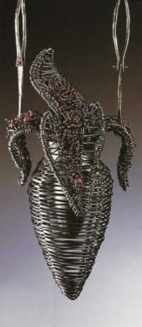 ![]() | Paul McClure, Sense (perfume bottles/pendant), 2001 Silver,steel cable, rubber Pendant: 3 x 1 x 1″ Intended to hold two separate scents in each of the containers (the wearer's and another's). |