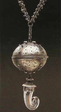Passed down from generation to generation, pomanders, often textured with filigree, niello, and repousse, studded with gems, or engraved or enameled with intricate or fanciful motifs, were more than exquisite and intricately sectioned baubles. Through the potent, precious scents they held, they, acquired a sorcery of their own. The mere wearing of a pomander on the body, or its presence in the, hand, was thought to guard the wearer and those in proximity against evil and disease.