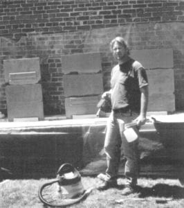 Our four painters - John Angelopoulos, Mark Drew, Lara Mitchell, and Bud Swensen - performed superbly (Fig. 7). Bud tried a flocking gun that Woodrow Carpenter kindly loaned us with an air compressor, and a wet/dry vacuum. Lara explored several different methods of hand-strewing, or pressing the smalt into the paint. John used a hair dryer with a delivery system he rigged, and various strewing techniques with a wide brush. Mark provided what proved to be the best tools - a weed-sprayer and a craft shop glitter gun (Fig. 8). Both these were hand-pumped, the kind of technology that was readily available to Warner's painters, and gave a nicely even coating. When he used one and then the other on top, the density increased and the result was a good thick coat, what Brian Powell felt was correct (Fig. 9). So this double application is what we will use when we do the actual painting, with luck, next spring. We are awaiting word from a foundation that may fund this project.