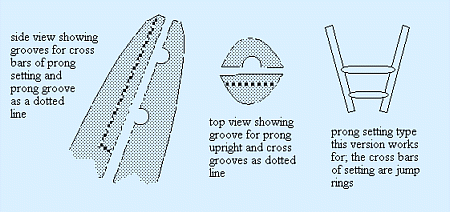Self-locking tweezers may be bought and then reshaped if necessary. A good shape is a half inch right angle bend at the end. This can be filed into so that single wires or prongs can be held during soldering. John Cogswell uses versions of these as extremely useful soldering jigs and heat sinks for constructing prong settings from wire. An example is shown where the tips of the tweezers accommodate two jump ring cross struts and a vertical prong, clamping them together for soldering with a pinpoint hot mini torch right in the tweezers. The setting is assembled one vertical prong at a time.