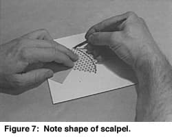 Cutting on enamel will dull the scalpel real fast. I keep a sharpening stone handy and draw the scalpel across it almost every cut. A diamond fingernail file works well also. Using the edge of the scalpel left up and pull off the decal material outside of your design shape. Just squeegee as per previous instructions. All all colors and shapes of your entire design.