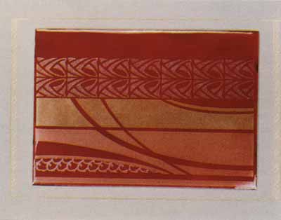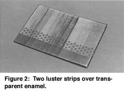 Now run strips of the luster decal material across the enamel colors giving you a kind of plaid effect. You may lay all of the decal colored strips and just fire once to save time (figure 2). This will allow you to view the final results ahead of time and help with laying out the colors of future work.