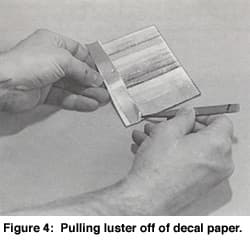 With a chipboard piece that has a straight edge, begin in the middle of your decal and squeegee outward in all directions until ALL WATER has been squeegeed out (figure 5). When you begin, it works best to drag the chipboard. When you think you have all the water out, start again in the center and push the chipboard gently forward, looking very carefully at the leading edge of the board to check whether there is any slight 'wave' of water being pushed ahead under the decal. It is imperative that all water be expelled from under the decal. Make sure there is no air trapped. You may re-cut the edge of the chipboard as it gets wet for a fresh edge to work with so you can use the same piece many times. You can get this material at most art supply stores or use matchbook covers as that is the right thickness of material to use.