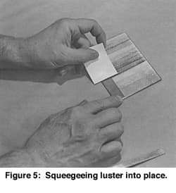 Using a soft tissue or paper towel, dampened slightly with distilled water, hold the decal with a piece of paper on top of the decal as the decal may stick to your finger (see left hand in figure 5). Gently wipe excess luster or gelatin off remaining surface of your glass/enamel wiping away from the decal in all directions. Do not panic if some of the luster has leaked out from under decal. It is just a but of excess and some colors do that. They will fire just fine…