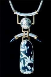 Since then, the spinning sphere has become a fundamental component of Lee's neckpieces. The Goddess Amulet, which took two weeks to construct, successfully satisfies all the rules of fine design: repetition, variety, rhythm, balance and proportion, and does so with only three basic elements. Hollow tubing, pierced and bent, is the foundation from which is suspended the signature spinning sphere. Three sizes of holes and lost wax technique add texture. Using medium sandpaper, which leaves tiny scratches on the surface, and finishing with a wire brush, Lee achieves a glow rather than a gloss. "It's the difference between the moon and the sun: the moon glows, the sun glares."