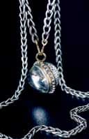| The Magic Orb pendant is constructed of a hemisphere of tourmalinated quartz paired with a hemisphere of drilled silver. |