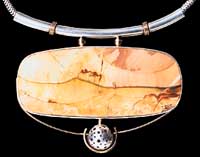 | Lee's designs originate from special stones, such as the large yellow-and-pink jasper that forms the focus of this pendant. 3-3/4″ x 3-3/4″ |