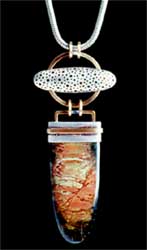 Gem cutting was a part of jewelry making she enjoyed. However, with two growing boys, ever-looming craft show deadlines, and the added burden of documenting and photographing her jewelry and Cliff's pottery, stone cutting had became one more chore eating away her studio time. Help came in the form of a trade show. She was delighted to meet suppliers of custom-cut gemstones, including Bill Heher, Gary Genouese, Bill Gangi, Tom Lane, and Michael Caldwell. "The cutters are passionate about their stones and have an eye for the unique," she says enthusiastically. Their wizardry released her from this task without forcing her to compromise her standards.