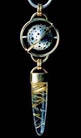 She began this masterpiece in miniature (it's only 1 1/2″ in diameter), with a cabbed round tourmalinated quartz, using 80 carats'-worth of stone. The stone, in the shape of a hemisphere, was a perfect mate for the other half of drilled silver. Running through the silver is a strip of gold with tiny silver dots resembling miniature spheres and giving the effect of the sun's rays. The Magic Orb spins from a 18-karat-gold hoop which hangs from a hand-made 32-inch chain.