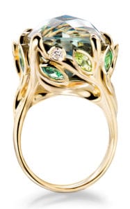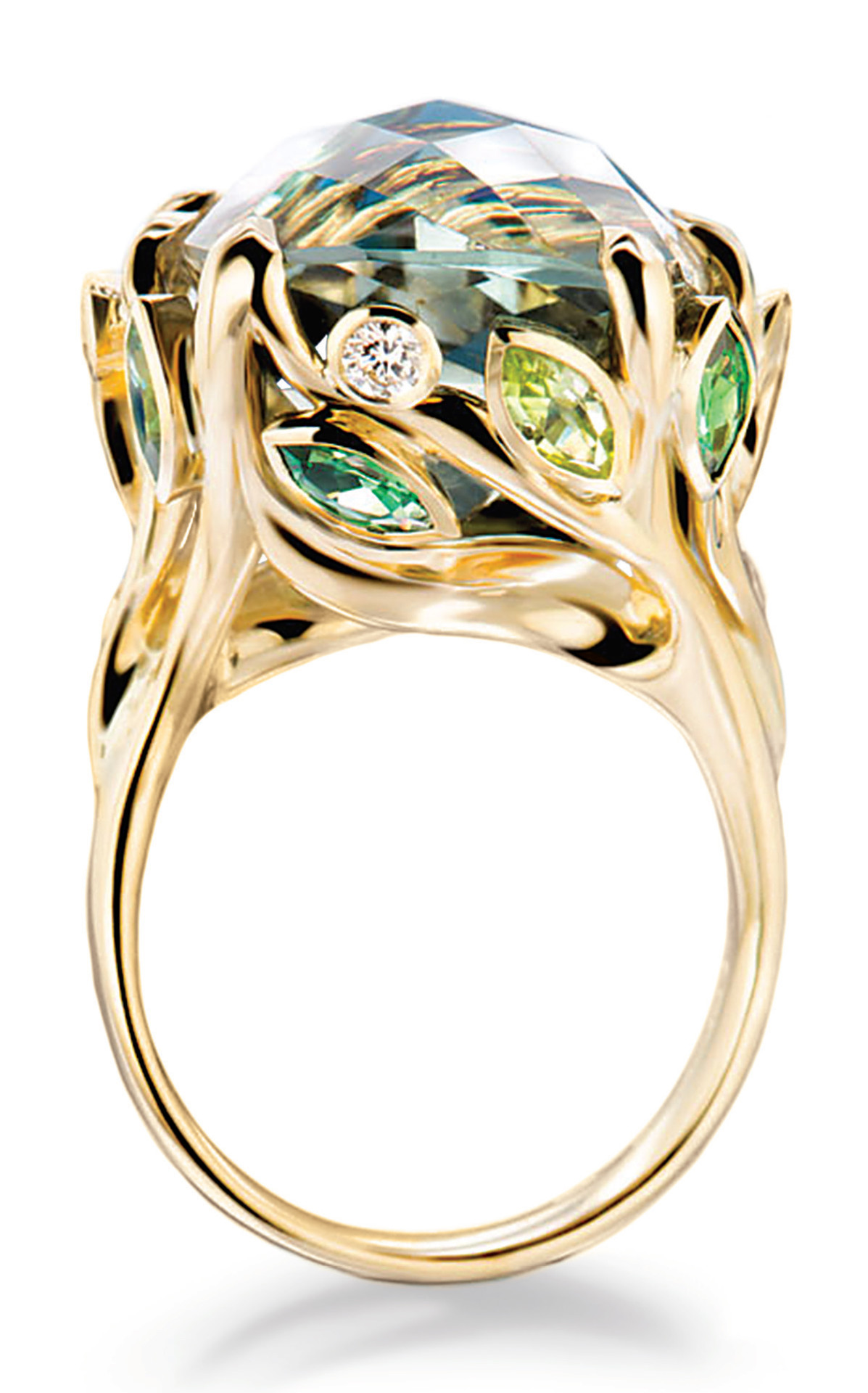 One of the gems in the box, a large green prasiolite, inspired the design for their award-winning ring. They envisioned the stone sitting in the center of the ring like a massive garden, surrounded by small diamonds and colorful gemstones that would symbolize garden fruits and the dewdrops that adorn them. "We saw the ring having a tangled, jungle-like effect while retaining balance and harmony," he says.