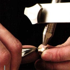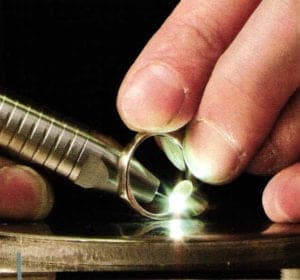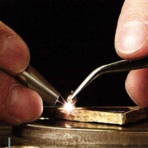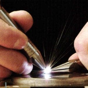 The small and compact PUK system includes a welding table, a grip and holder, a selection of clamps and an optical unit. The work piece should be well positioned on the welding table in order to ensure there is an optimum electric contact. If this is not possible, a clamp can make the electric contact to the PUK Depending on the selected working situation, the clamps or the welding table are connected to the PUK device. The welding should only be observed through an optical unit that darkens automatically. The welding process itself is automatic The sharp electrode located in the handle closes the electric circuit when it touches the jewelry metal and starts the welding procedure. A short light arc is emitted from the point of contact. The metals melt with a small and stable welding point of 0.6 - 3 mm diameter. The welding point penetrates deeper into the metal, the higher the welding performance and the less thermal conductivity the material can offer. A protective gas prevents oxidation on the jewelry metal during the welding process. During welding, additional, suitable material in the form of a wire with 0.3 mm thickness can be added to the jewelry or work piece. Experienced users will also find it easy to close pores. In general, the welding result is dependent on the metal's melting point and thermal conductivity. Like with all new methods, novice users are recommended to carry our trial welding on various metals and with different degrees of intensity, as the results and the quality of the welding are dependent on many factors. Different metals and alloys behave very differently indeed during welding. The metal characteristics such as conductivity, melting point and any possible, slightly volatile alloy elements have significant effects on the results of the welding In general, all standard and known precious metal alloys made of gold, silver, platinum and palladium can be welded This also includes trend metals such as stainless steel, titanium or steel-cobalt alloys.