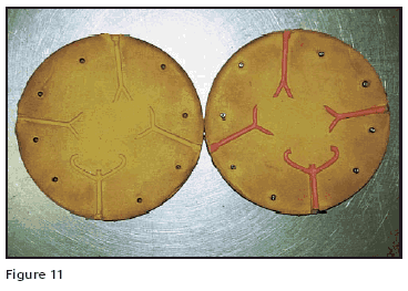 Casters have a practice of classifying their patterns for flask temperature, Heavy, Medium and Light. Most casters would classify two of the patterns on the tree in Figure 9 as heavy and one each as medium and light. The term System Temperature is used to describe the effect that surface area and volume (surface area to volume ratio) have on the cooling of the metal and the subsequent increase in the temperature of the investment at the metal interface for a specific pattern, flask and metal temperature and alloy. The pattern with the grooved surface has less volume of metal as the other 4 mm thick pattern and the surface area is somewhat more. Because of that it might cast better at the 'medium flask' temperature. We can conclude from this that: