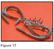 Sometimes pattern position can make a difference too. A silver pin in the form of a bow with stone setting prongs in the center is an example of such a feed sprue study. When the system temperature that produced the smoothest as-cast surface was used, several feed sprue configurations were tried with strongly varying results. The single feed sprue in Figure 14 produced shrinkage porosity on the opposite loop from the attachment point. Adding a second feed sprue, Figure 15, only moved the porosity. When the position was changed from vertical to horizontal with two feed sprues, Figure 16, the porosity was eliminated but prongs did not fill completely. The prongs could be filled in this position by increasing the metal temperature but the surface was not as good as desired.