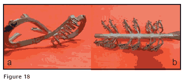 To our surprise, adding a third feed sprue to the center, Figure 17, still didn't fill the prongs completely. Finally, using two feed sprues and facing the pattern to the flask wall gave excellent results, Figure 18a. Figure 18b shows the successful feed sprue arrangement on the left side of a tree with a control pattern of a previous arrangement on the right. If the control patterns cast as expected and the new feed sprue is better, then you can be more certain that there is real improvement in the feed sprue design and the result was not an anomaly. Why the position made a difference in this case is not known and this subject needs more study.