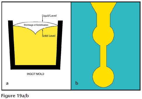 At the beginning of this article, a promise was made to discuss gates in more detail. Remember the discussion about the shrinkage of solidification and metal flowing to fill the void space it causes. If you have ever cast an ingot, you have undoubtedly been witness to this shrinkage. When the ingot is first poured, the liquid metal is slightly domed on the top, Figure 19a. When the metal has solidified, the top will have a big sink that is greatest in the center. The difference in volume is nature's graph of the volume lost to the shrinkage of solidification. If a casting were made with two spheres connected by a rod, as pictured in Figure 19b, and fed at one end by a large feed sprue, the metal would fill the entire cavity. The little rod would be the first place to start freezing, because it has relatively little volume compared to the surface area in contact with the investment.