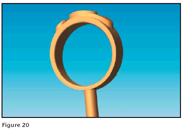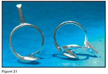 The ring on the right in Figure 21 has a secondary feed sprue and cast with porosity at the top. The ring on the left side was reworked making the top thinner and the shank thicker. The reworked ring has the same weight as the original and looks the same on the finger, but it is easier to wax, and will cast without porosity. This is an example of designing high cost of production in with the original pattern and designing high production cost out in the reworked pattern.