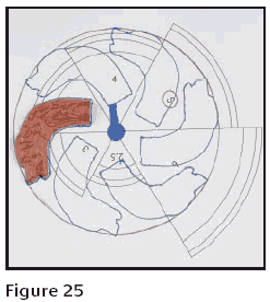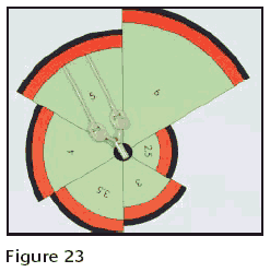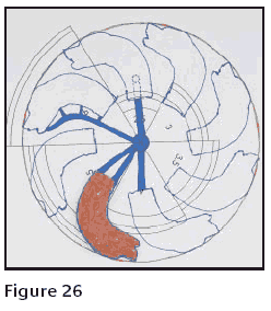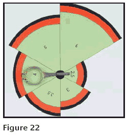 Properly designed feed sprues are one of the most important aspects of a master model and should be well studied before something is attached. Here is a simple little template that I call a Sprue Gauge. I made this to help the model maker design the feed sprue attachment*, Figure 22. The black line represents the cylinder or flask wall. The red area is the safety zone of investment into which the wax patterns should not extend. The black dot in the center is the main sprue. The red line on the pattern shows where a line is engraved on the master model so the tree maker knows where to cut the wax to get uniform feed sprue length.