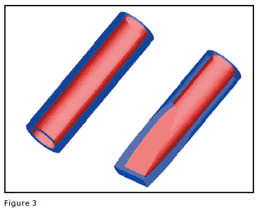A few years ago, some simple experiments were carried out to help understand the fluid dynamics of feed sprues. Two 3 mm tubes were produced and attached to the end of a pipe. One tube was 3mm inside from end to end and the other was squashed flat on one end to mimic a sprue that had been hammered to a flat taper, Figure 3.