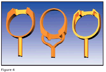 In Figure 4 we can see the same ring shape in three configurations. The ring on the left has a thin shank, the top is solid and heavy and a nice feed sprue is attached to the bottom. This ring would surely have a great deal of porosity if it were cast as shown. If the requirement was to cast the ring without secondary feed sprue starts to fill. This can be tested with a rubber mold by turning the wax injector pressure down until the pattern fill is incomplete. If the secondary feed sprue is feeding from the pattern as well as the primary feed sprue and is discontinued between the two points, then it is back feeding and not doing the intended job.