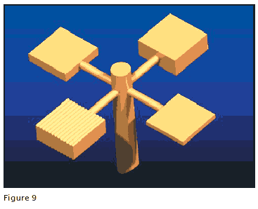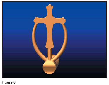 In Figure 5 is an example of an unbalanced feed sprue that back feeds. The metal will fill the pattern before the secondary feed sprues start to fill. The last point to fill will be mid-point of the secondary feed sprues. Figure 6 shows a more balanced feed sprue system in which the metal will flow to the top of the cross in about the same time it flows to the arms of the cross and the last points to fill will be mid-arm on each side. Notice that the attachment point to the main sprue is different than that in Figure 5.