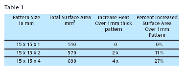 If we cast three patterns that were 15 x 15 mm x 1, 2 and 4 mm thick respectively, Figure 8, on the same tree we could say that the casting conditions were the same for all three patterns, because the investment and the metal were the same temperature when the metal was cast. The surface area on the top and bottom of all the patterns is constant; the only increase in surface area on the larger patterns is on the sides thus the volume increases much faster than the surface area, Table 1.