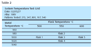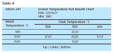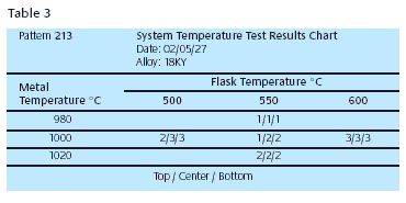 After the castings are graded, the score (1, 2 or 3) for each pattern number is recorded on a test results chart, Table 3. The test data is easy to understand in this form and trends can quickly be seen. The example in Table 3 clearly shows the best flask and metal temperature for casting pattern # 213 in alloy 18KY. Pattern 213 was picked to represent a larger selection of patterns that were judged to have similar surface-to-volume ratios and, therefore, would be expected to cast well at similar flask and metal temperature. So all patterns that are represented by pattern 213 in the test should be cast at metal 980° and flask 550°.