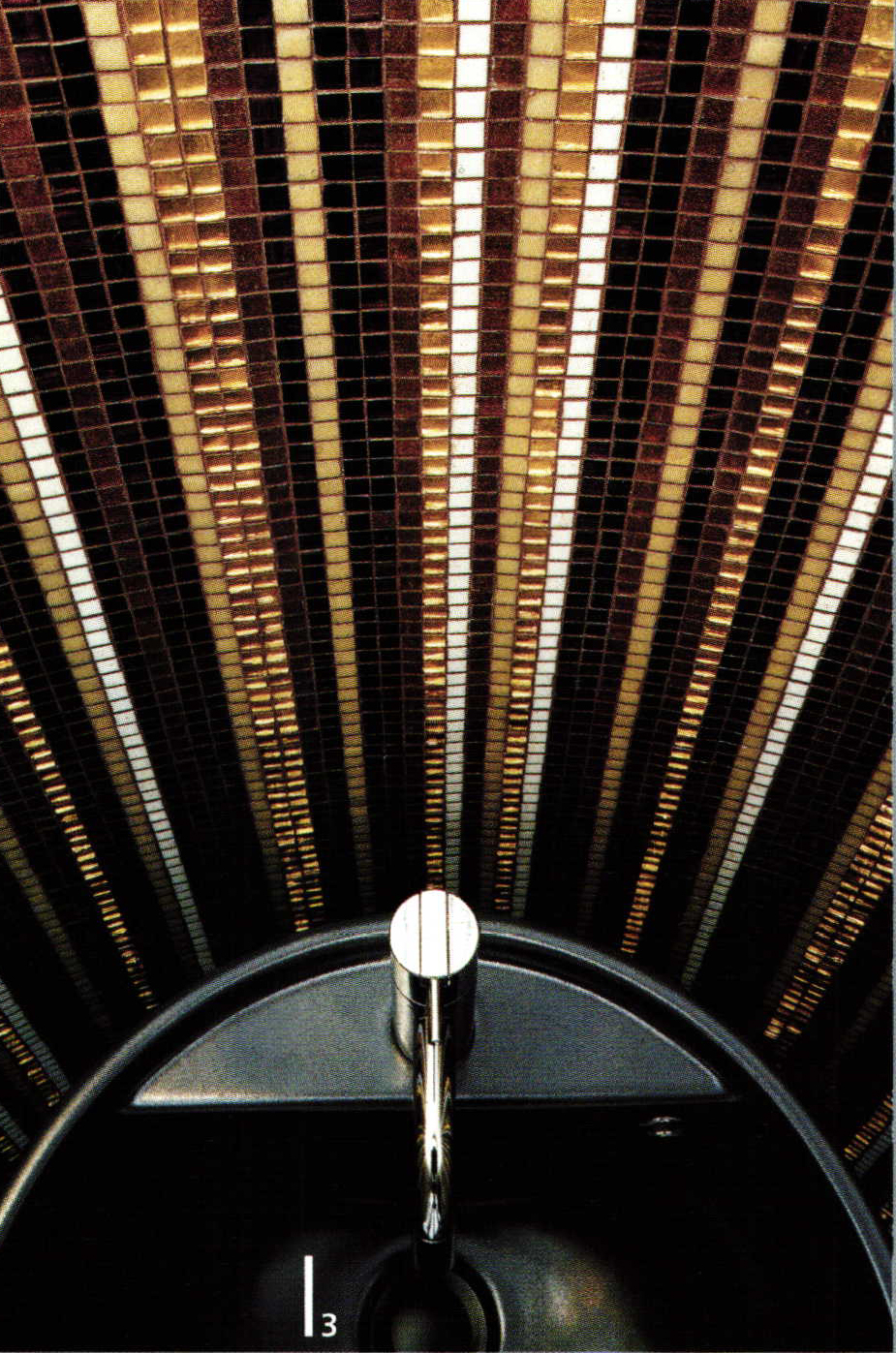 The company was set up in 1956 and it hails from the Italian art industry where it only manufactured glass mosaics for outdoor walls and floors. It was only in the mid-80's that Bisazza started developing glass mosaics for indoors to constantly expand his expertise and visibility in designing public and private swimming pools, baths and wellness zones. Internationally known hotels such as the Ritz Carlton in Berlin or the Hamburg-based Dorint Hotel had their wellness zones equipped with Bisazza mosaics and even athletic celebrities and stars of the entertainment world love the Italian art of the mosaic. The singer Cher and formula 1 pilot Ralf Schumacher relax on these beautiful glass squares in their private homes. The specialty of this Italian enterprise is working aventurine, an artificial semi-precious stone developed in 17th-century Venice that lends Bisazza's precious "le gemme" tesseras their irresistibly copper color tone. This aventurine is pulverized to a fine dust and added and stirred into the liquid glass mass. That means that you can see every movement of the finished stones mixed with the precious stone compound so that no one stone resembles the other.
