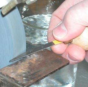 I complete the shaping of the point at the bench using a heatless grinding wheel. For the last step of shaping, I grind about a 45 to 60-degree angle on the tip of the graver to prepare for the sharpening process.