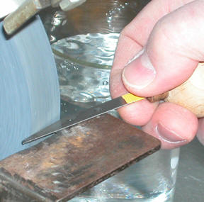 To reduce the area that requires sharpening and polishing (the cutting end), grind away about an inch of the length portion above the point. Periodically dip the graver in water to keep it cool during this step. Overheating it will cause loss of tool temper and point strength.
