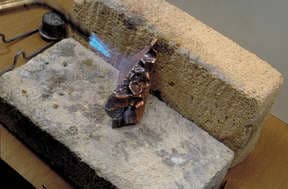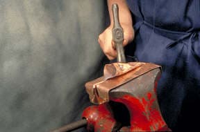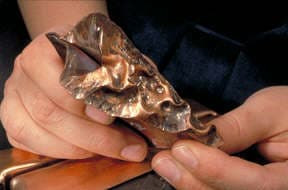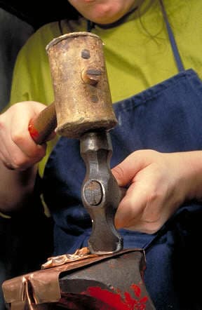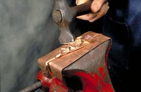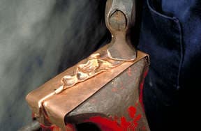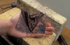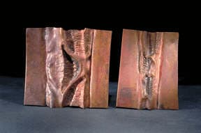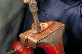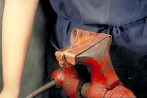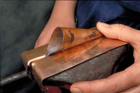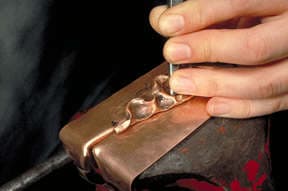 This article describes the steps to making a chased wedge T-fold. To begin with a loop is made from a rectangular piece of sheet metal. The loop is placed into the vise and the jaws clinched tight onto the loop. You can see the angle the loop is tilted to in the vise. Vary the angle to alter the results.