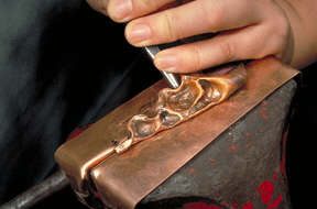 Chasing begins. It is important to slide the tool across the metal to keep the marks smooth.