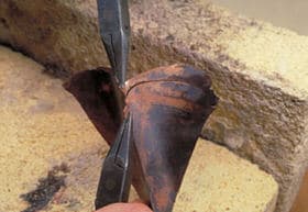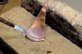 The cup is annealed now, turning it over to ensure that all the layers are evenly heated. Then it is quenched. Quench it fast and deep in water and hold it down until it has finished quenching. If you were to take it out too soon scalding water could squirt across the room.