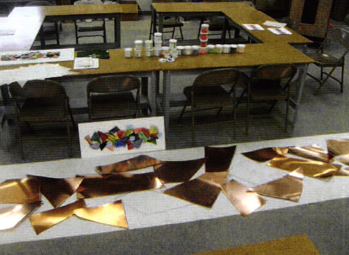 Without hesitation, each section of copper was cut to size using a shear. The edges and corners were then slightly bent because of the overlapping and to obtain more of a three-dimensional look. To avoid hammer marks, I was able to hand bend the specific areas over a table top. After the copper was laid out, it was time to finally begin enameling.