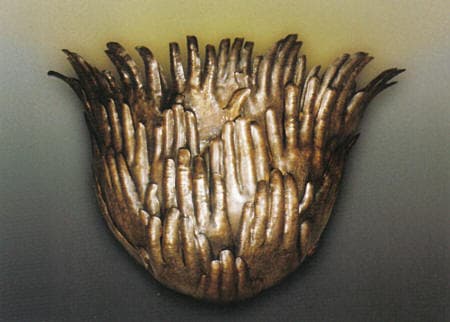 As her sons neared the age of their Bar Mitzvahs, Eid became interested in making Judaic objects for her family. A Seder plate exhibited at the Spertus Museum in Chicago was the entree to her first large-scale commission for a synagogue. For her, this work has turned out to be the perfect blend of the gift of making and the belief in what you're making. On her desk is a paper model of an Eternal Light she created for her synagogue. Each member's hands, from young children to the very old, were photographed and photo-etched into metal. The cut-out hands surround the light, appearing at first as an oversized unfolding flower, but a closer look reveals the individually expressive shapes of worshipping hands. A simple but powerful statement of faith and community, the sculpture illustrates one of the key themes of Eid's artistic life.