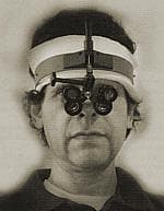 | The artist wearing his forty-power surgical binoculars. Photo by Robert Sauber |