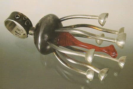 Nanopod also has facilities for glasswork, including torches and annealers for flame working and a larger kiln for glass fusing and casting. "I was looking for a medium that could offer transparency and convey a sense of "flow," says Terran, who added glass to her artistic arsenal several years ago. "I also discovered and was greatly inspired by the glass works of the Blashka brothers, who made scientific models, and works based on the drawings of biologist Ernst Haeckel." Her lovely Perelandrian Ring features a glowing red glass tentacle surrounded by silver tendrils that sprout from a mushroom-shaped base perched high on a band. Terran does her multimedia work at home, where she shares a digital audio and video studio with her collaborator and partner Andrei Gravelle.