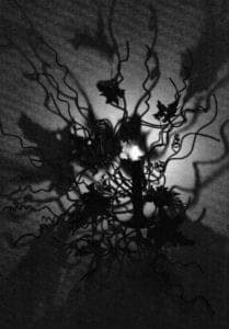 In these new pieces, the metal forms interact with sculptural space in provocative ways. With her characteristic mastery of materials, Kingsley has fashioned flowers, branches and tendrils in woven configurations that catalyze the surrounding space and cast dancing shadows. She surrenders to an involved process of observation, inspiration, fabrication and, finally, liberation. As each piece becomes whole, united with its crucial light source, it takes on a new life. The transitory flame flickers, the shadow pulses, sculptural space comes alive.