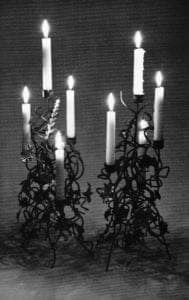 In contrast, Kingsley's most recent body of work assumes, at first glance, a quiet domesticity for one sees chandeliers, candelabras and small candleholders. These functional, candle-related sculptures contain only vestiges of the earlier works' eeriness. But the new work was conceived in darkness, and it is in dim candlelight, the netherworld of shadows, that these embranglements best live.