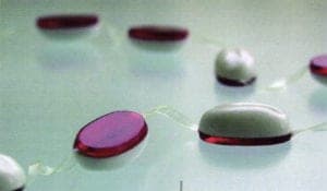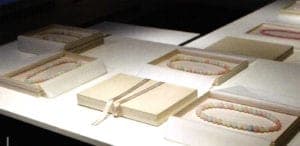 'Flavored Coffee Beans' chain made from cast porcelain, glazed and acrylic. The beans are assembled using a strong and transparent Japanese rubber band