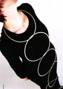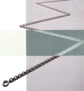 Susanne Hammer is also renowned for her often ironic interpretations of chains. She alienates chains industrially produced as fashion jewelry and re-interprets something which is already well-known. This is highlighted in her first piece, 'Zig Zag', produced in 1996: to create the piece, she reinforced a long silver chain to make a zigzag shape by soldering together the links. Pure irritation in a wearable form. The 'Necklace' chain, spelt out as if handwritten and the clasp in the shape of a 'Closed' sign, are yet more examples of the ironic literal transfer of function to form. The 'Duo' work too highlights her approach: what appears at first glance to be a conventional chain of links reveals itself upon closer inspection to be made from differently sized and interwoven link chains. These can then be transformed into a pendant with one quick movement. The chain mutates into an indefinable ball hanging on a thin chain. With 'Cut-out', part of the lower collar is cut out of a T-shirt and threaded on a metal chain. Only when the chain is worn around the neck is the T-shirt a complete and unified whole again. This idea embodies the ideal combination of jewelry and fashion; an item of clothing and an accessory merging into one.